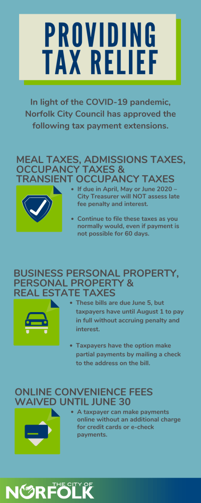 Norfolk City Council approved a comprehensive tax relief program during their March 24 meeting that eases financial burdens during the coronavirus pandemic. The program will give taxpayers and business owners the option to delay payment on business taxes and personal property taxes.