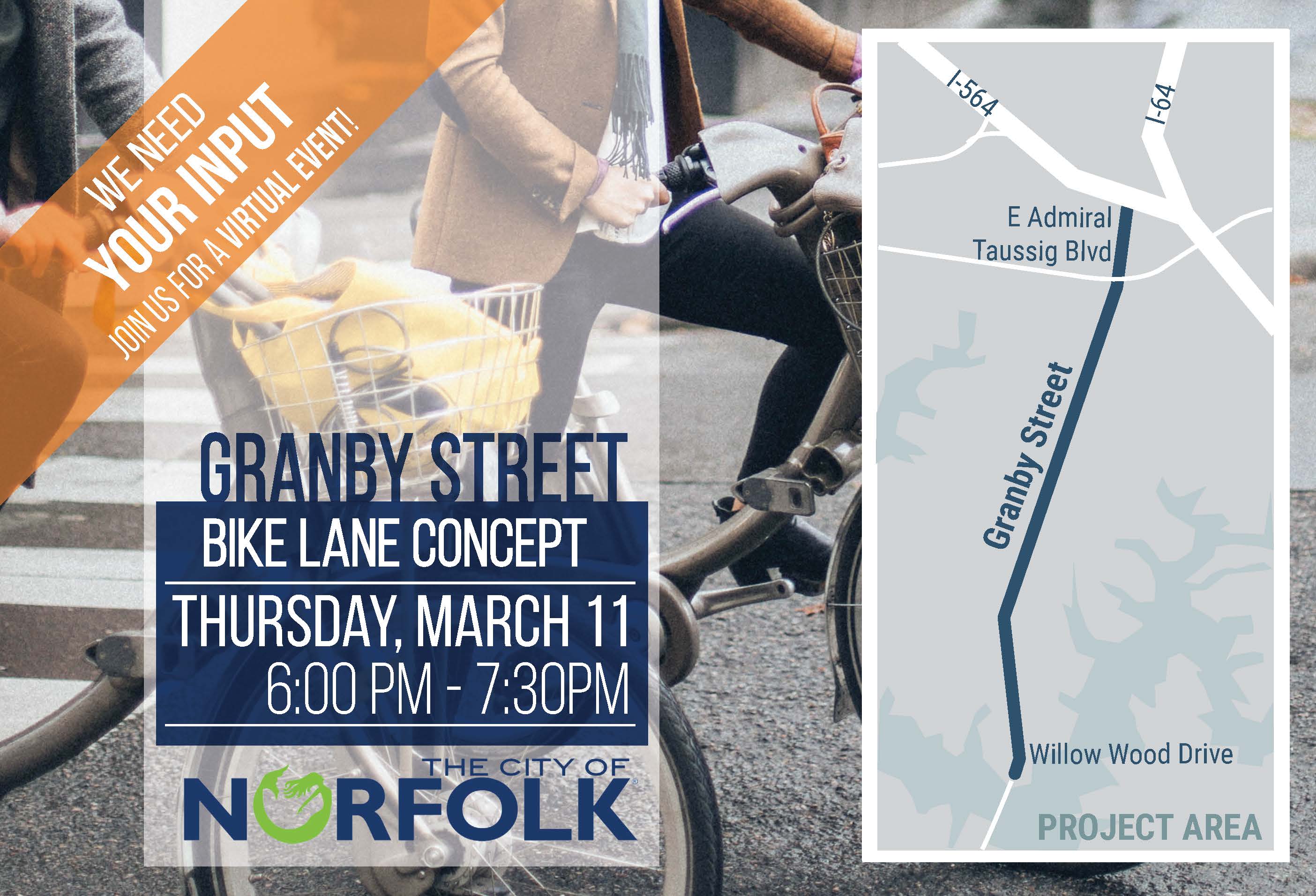 If you walk, drive, or bike along Granby Street between Willow Wood Drive and Admiral Taussig Boulevard (just south of the I-564 overpass), the City of Norfolk wants to hear from you. The Department of Transit is hosting a virtual workshop on March 11, 6:00 – 7:30 p.m., to gather public input as part of a project development effort for bike lanes along Granby Street.