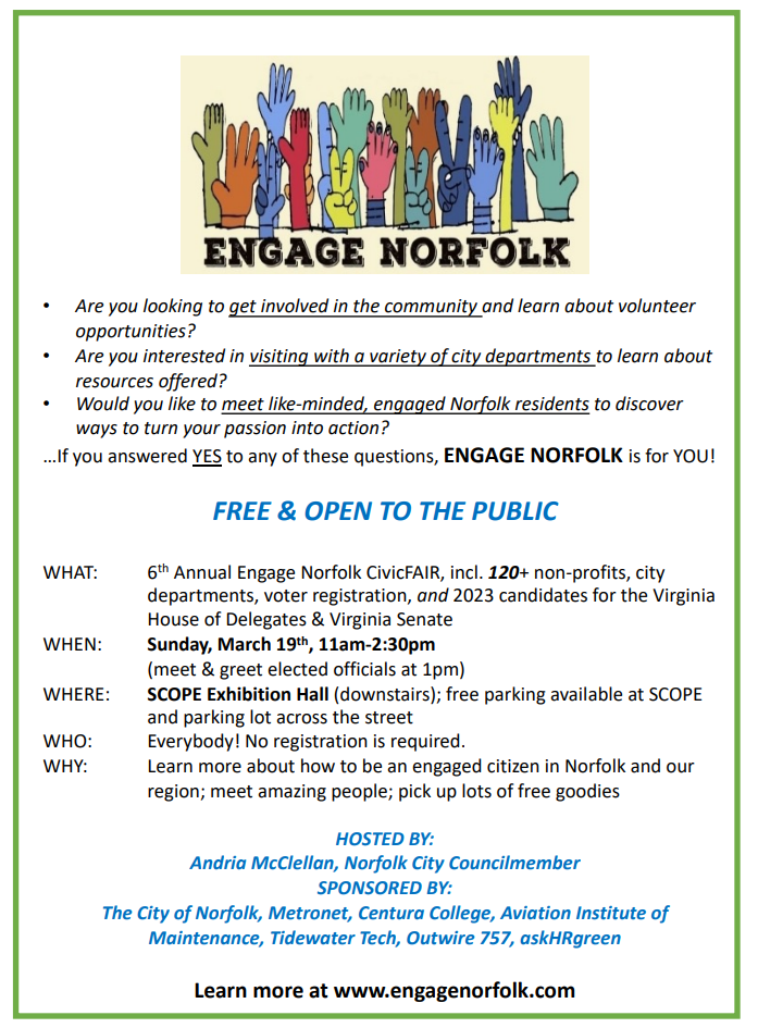 Norfolk Councilwoman Andria McClellan invites you and your neighbors to attend the 6th Annual Engage Norfolk event on Sunday, March 19th from 11am-2:30pm at the SCOPE Exhibition Hall (downstairs at Scope, free parking is available). The event is free and open to the public; no registration is required. Attendees will be able to visit more than 100 non-profits and city departments, register to vote, learn about valuable city resources and assistance, as well as meet federal, state, and local elected officials and the 2023 candidates for the Virginia House of Delegates and Virginia Senate.