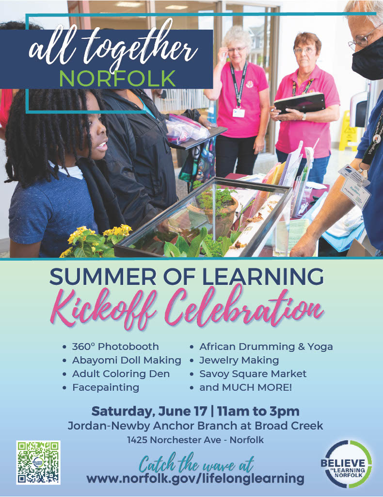 A Summer of Learning will consist of free learning events and activities for Norfolk residents of all ages. The event will last seven weeks, from Friday, June 17th to Saturday, August 5th, and will include a Kick Off Weekend hosted at several locations throughout the City of Norfolk. This year’s theme is “All Together Norfolk” and aims to symbolize community and unity.