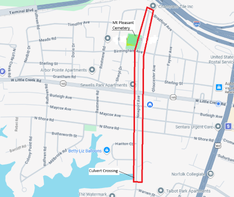 It will take place along Newport Ave starting at the north end near the railroad tracks at Bradford Avenue and move south crossing Little Creek Road continuing south on Newport to the tidal water culvert crossing.